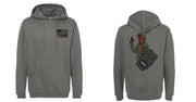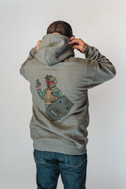 Our Mando ballistic shield operator standing by to get some, printed on a heavy-weight gray pullover hoodie.